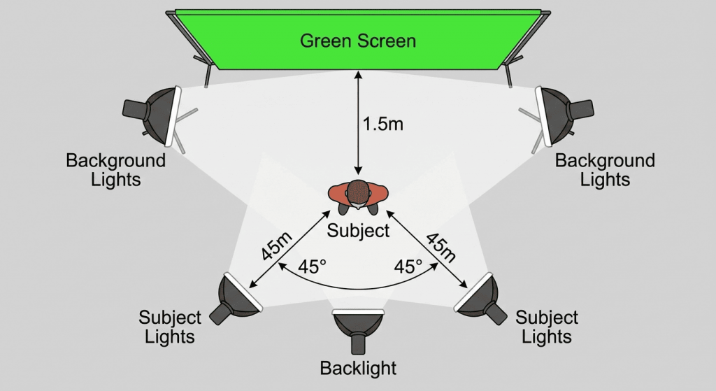 - Subject Lights (x2): Use two more lights (your main key light and fill light) in front to illuminate yourself. These should be positioned so no light spills onto the green screen behind you.